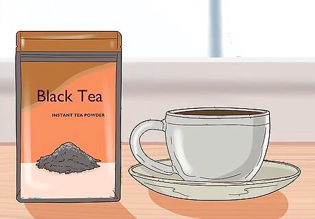 Use tea to change your hair color. Although the coloring teas made by steeping plants in water aren’t as permanent or strong as commercial dyes, they can still change the color of your hair, especially if you repeat the treatment frequently. To darken hair with tea: Choose a loose-leaf black tea or black tea powder and steep one-half cup (72 grams) of tea in two cups (16 ounces) of boiling water. Allow the water to cool with the leaves still in it. When it reaches room temperature, strain out the leaves and transfer the tea to a spritzer or spray bottle. Spray your scalp with the tea water and massage it gently in to the roots of your hair down towards the tips of your hair. Twist your hair or pile it on top of your head and secure it with a large plastic clip. Then, cover your hair with a shower cap or plastic wrap and let the tea sit for an hour. Rinse with lukewarm water only and style as usual. For best results, repeat on a weekly basis.
