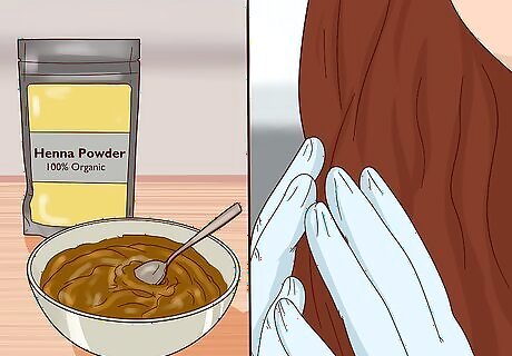 Give henna a try. Henna is a plant-based powder that has been used for centuries to dye hair, skin, nails, and much more. Although the powder is green, henna will naturally dye your hair a reddish-orange. Mix about three tablespoons (45 grams) of henna powder with enough boiling water to form a thick paste. Then, let the mixture sit in a cool, dark place for about 12 hours. When the mixture is ready, put on disposable gloves and apply it to your hair with a tint brush. Pile your hair on top of your head and wrap it in plastic wrap. Let sit for at least one hour, and for as long as four hours for a more intense color. Rinse with water and a gentle conditioner when your time is up.