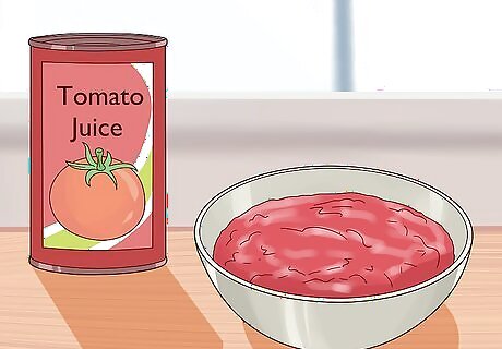 Give your hair a richer red with tomato juice. Open a fresh can of tomato juice. Reserve about two cups (16 ounces) of juice and refrigerate the rest for other uses. Either dip your fingers into the juice and then massage the juice into your hair and roots, or apply the juice to your hair with a tint brush. When all your hair is saturated, pile it on top of your head or twist your hair up and secure it with a clip or bobby pins. Cover your hair with a shower cap or plastic. Let it sit for 30 minutes, and then rinse thoroughly with lukewarm water. Repeat weekly for best results.