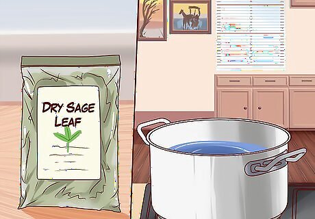 Try a sage rinse. If your hair is black or very dark brown, you can bring out these natural colors using sage. If your hair is graying, sage can also serve to hide gray hairs. Use dry sage, which you can buy at most supermarkets. Steep about a handful of sage in a quart of boiling water for at least 30 minutes. Allow it to cool. Strain the sage and water. Then, pour the mixture over your hair 15 times. Make sure to catch the mixture as it falls through your hair, using a bowl or basin. You'll want to re-use the same substance. Allow it to sit in your hair for 30 minutes before washing it out with cool water. This is a method that takes awhile to work. The effect will build over the course of a few weeks. Repeat this process weekly until you get the shade you want. From there, re-dye your hair once a month to maintain that shade.
