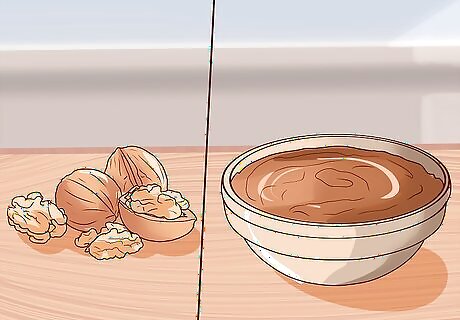 Try walnut hulls. Simple walnut hulls are something many swear by when it comes to darkening hair. Walnut hulls (the nuts' outer casings) stain easily, so be careful when using this method. It's a good idea to wear gloves. Walnut hulls also require a lot of preparation before they can be used on hair. Crush the hulls into a paste. How much you use depends on how much hair you have. You want to be able to coat your hair completely, so you'll need more for longer hair. Cover the paste with boiling water and a dash of salt. Allow the paste to soak for three days. Then, add 3 more cups of boiling water and simmer for five hours. Make sure to simmer the walnut paste in a non-metal pan. Strain the liquid and place the remaining bits of walnut hulls in a cloth sack. Twist the sack very tight, making sure to strain out any remaining juice. Place the remaining liquid in a pot and boil it until it's about a quarter of its original volume. Add a teaspoon of ground allspice to the remaining water. Place the mixture in your refrigerator for about a week. Then, apply to your hair as you would a sage or alder bark mixture.