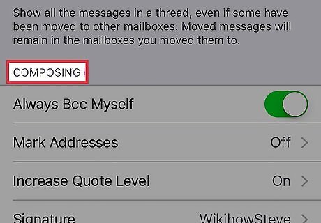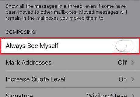 Slide the Always Bcc Myself switch left to the "Off" position. It should turn grey. Now whenever you compose an email within the Mail app, you won't anonymously attach your email address to the outgoing email. If this switch is already grey, you aren't bcc-ing yourself when you send an email.