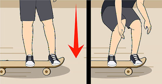This will help you gather the momentum you need to pop your board. While in most skate tricks, you'll be told to lean forward a little, for the nollie, you can actually lean back on your back foot a bit. You'll need to lift and raise that back knee before you raise your front one. You should also bend down with your back and arms to help yourself get nice and low. Your hands should fall somewhere between your knees and your ankles before you pop up.
