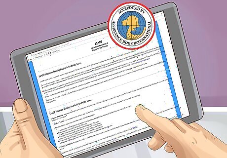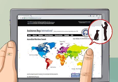 Get assistance from a reputable trainer. Given the expense of having a service dog professionally trained, mainly handlers decide to train their own dogs. However, even if you're self-training your dog, you can still benefit from advice and assistance from an experienced trainer. A good place to start is with a trainer accredited by Assistance Dogs International (ADI). Trainers go through a rigorous process to become accredited, and are assessed regularly to ensure they continue to maintain the organization's high standards. You can search for ADI accredited members near you on the ADI website at https://www.assistancedogsinternational.org/members/programs-search/.