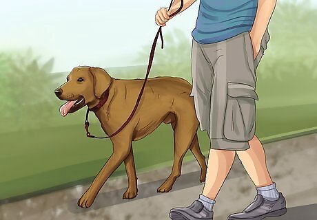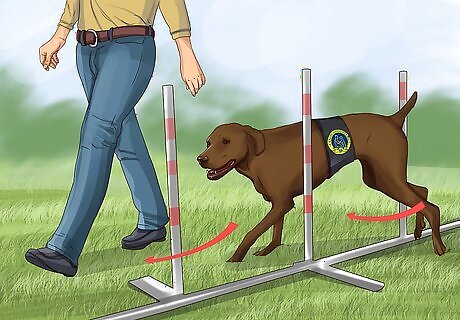 Practice walking nicely on a leash. Walking close by your side without pulling or jerking on the leash is one of the most important skills a service dog can possess. You can start leash training when your dog is just a puppy. Put the leash on the puppy's collar and walk short distances inside the house. As your dog becomes more proficient with leash walking, introduce more and more distractions that might cause it to lose focus. Reward your dog when it doesn't respond to distractions. ADA regulations specify that your dog should be in your control at all times. If your dog cannot walk calmly on a leash in a public place, it is not in your control and should not be taken out in public.