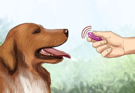 Start with clicker conditioning. Because a clicker only takes 1/10th of a second to complete, it marks the exact behavior you want your dog to repeat. This level of exactness will make the rest of your training go more smoothly, since you can communicate more clearly with your dog. First condition your dog to respond to the clicker. Click the clicker 20 times in a row, giving your dog a treat after each click. When you click it the 21st time, watch how your dog reacts. If your dog is looking for a treat, give it one. If it isn't, do another 20 clicks until the dog starts automatically expecting a treat when it hears the clicker. Once your dog is clicker-trained, make sure you always give it a treat whenever you click. If you stop giving treats every time, the conditioning will unravel because your dog won't know whether to expect a treat when it hears the click.