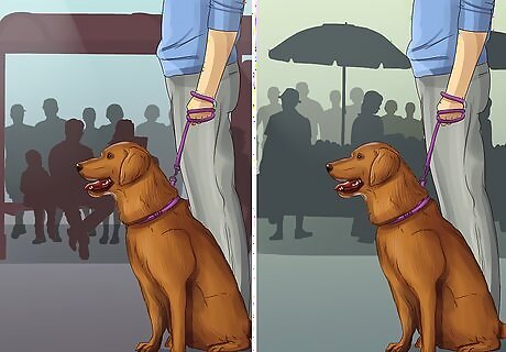 Work on focus in public places. When you're out in public, your service dog should be focused on you at all times, ignoring all distractions. Spend many hours with your dog in different types of public places that may have different hazards and distractions to break your dog's focus. You may want to spend the bulk of your time training in public going to places you frequent. Your dog should be most familiar with these places at different times of the day and night. Start your public training by going to places when they aren't particularly busy and there are likely to be fewer distractions. When your dog is able to maintain focus, go at a busier time.