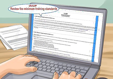 Review the minimum training standards. There isn't a universal regulating body for service dogs, nor are there any legal requirements for training. One organization, the International Association of Assistance Dog Partners (IAADP), has developed minimum standards to guide handlers who want to self-train their dogs. You can read the minimum training standards developed by the IAADP at http://www.iaadp.org/iaadp-minimum-training-standards-for-public-access.html. The website has additional resources you can use in your training programs, including sample daily training logs you can use. The IAADP recommends at least 120 hours of training over a period of 6 months or more. At least 30 hours of training should be spent in public places, where your service dog can practice focusing and ignoring distractions. Training for specific disability-related tasks can take longer than the minimum 120 hours. The more tasks you expect your service dog to do, the more time you will have to devote to training.