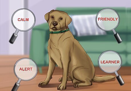 Evaluate your dog's temperament. Any dog must have a particular set of qualities to have potential as a good service dog. Your dog may be a relatively obedient and well-behaved pet, but that still doesn't mean it's cut out to be a service dog. Generally speaking, service dogs should be calm, friendly dogs that are quick learners and can retain information. You want your service dog to be alert and attentive, but not one that reacts to every trigger or chases every distraction. If your dog seems willing to please and tends to follow you around a lot, it might make a good service dog. Service dogs can be any breed. Some breeds, such as Golden Retrievers, make good service dogs because of breed characteristics that give them the right temperament.