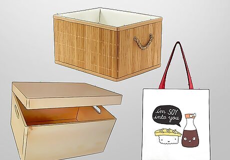 Purchase storage containers that look good out in the open. When you’re living in a small house, you may not have a lot of room to hide bins, baskets, and other storage receptacles. Because of this, try to use containers that provide plenty of space but also look good. Some common examples include: Storage chests Vinyl equipment cases Decorative baskets Hat boxes Graphic bags