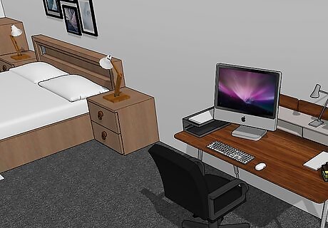 Use your bedroom as an office or den. For most people, a bedroom is a private area that doesn’t easily convert into a family or guest room. However, bedrooms are often the perfect location for a home office, personal den, or other private space. Converting your bedroom into a multi-purpose personal area will open up more rooms throughout your house without removing any privacy. If necessary, divide the room into quadrants so you have distinct areas for sleeping, relaxing, doing work, and the like. For particularly small rooms, see if your furniture items can serve 2 or more purposes, such as using your bed as a sofa or office chair.