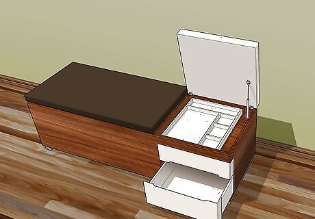 Purchase furniture that has multiple uses. When maximizing space, perhaps the best thing you can do is invest in furniture items that have 2 or more uses. Often referred to as smart furniture, these objects fulfill a main function, like seating, while hiding a second function within, typically additional storage. Common forms of smart furniture include storage cubes that double as foot rests, tables that come with drawers, and cabinets that contain a desk-like board you can pull out. Look for objects around your house that can serve multiple functions, such as a chair you can attach a storage bag to or a TV stand you can keep things on. You can often find cheap furniture at garage sales, thrift shops, and flea markets, many of which either serve multiple purposes or can be easily converted into multiple-purpose objects.