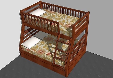 Buy a loft bed or futon. Depending on how much room you have, a full-sized bed may not be a good option. Instead, try going with something that better utilizes the space around it. For tiny houses, a loft bed installed over your bedroom will open up a massive amount space. For houses where the bedroom doubles as the living room, buy a futon so you have both a couch and a bed. If you end up purchasing a regular bed, try to get a model that has drawers inside the bed frame. If you want to use your current bed, try holding it up on firm wooden blocks to create extra storage space underneath.