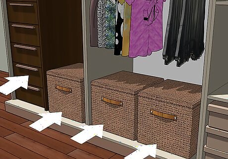Use drawers and racks to maximize your closet space. Due to their odd shape, closets can be hard to organize effectively. To fix this, place thin dressers on the floor of the closet and install hanging racks, shelves, and similar items higher up. If you’re left with a small patch of unused space, fill it with a plastic storage container, basket, or similar item. If your house does not have a closet, keep your clothes in a dresser or similar container. Try keeping clothes and other small items inside purses, luggage containers, and similar objects.
