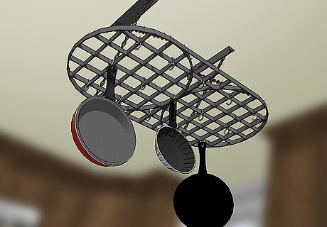 Install a pot rack in your kitchen to hold cooking supplies. Bulky items like pots and pans can take up a lot of unnecessary space in your kitchen cabinets. To fix this, try hooking them onto a wall-mounted pot rack or similar device. This will open up a lot of extra space for heavier and more fragile items. Instead of a professional pot rack, try purchasing a large pegboard. This will allow you to arrange your supplies in any way you see fit, conserving space in the long run.