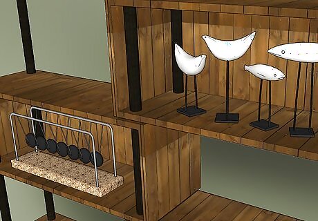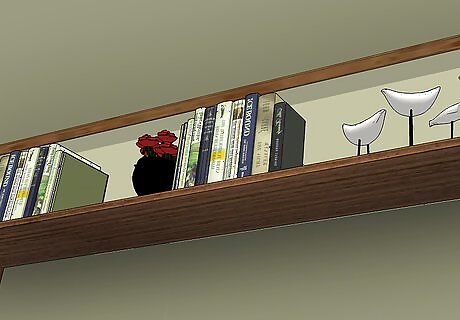 Store items high on the wall. When possible, mount floating shelves on your walls to hold lightweight items like books, figurines, and small electronics. For bulkier items like musical instruments and potted plants, see if you can hang them by attaching adhesive hooks or anchor screws to the wall.