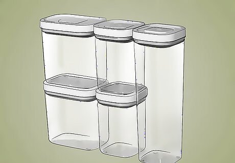 Purchase kitchen containers that stack. Often, kitchens fill up quickly because the owner purchases a lot of incompatible storage containers, dinnerware, cups, and similar items. To avoid this, do your best to purchase supplies that stack neatly together, limiting the amount of space each object takes up. This is especially important for tupperware containers since they’re often designed to be large and bulky. In addition to stacking items, keep small objects inside large containers like dutch ovens.