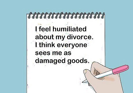 Sit with your emotions without pushing them away. A part of dealing with shame involves letting yourself feel the emotions underlying it. Name the emotion beneath your pain and sit with it. For instance, maybe you feel humiliated about your divorce. Because you wouldn't acknowledge the humiliation, shame crept in. Say something like, “I feel humiliated about my divorce. I think everyone sees me as damaged goods.” Afterwards, sit with that feeling without trying to push it away. Consider journaling about what you feel when you feel shame. Whether it's a person or other feelings you normally keep buried, it is important to acknowledge them to yourself.