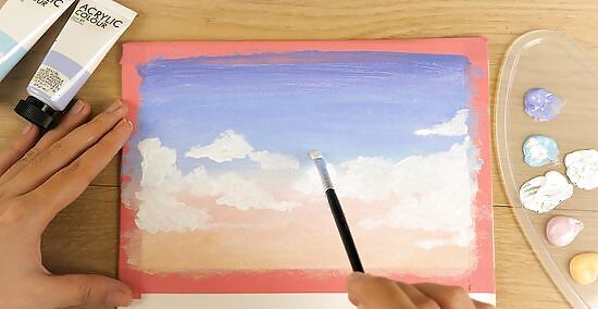 Paint the clouds. Take some white paint and the smallest amount of the lightest blue you can find. Mix them together for a slightly tinted cloud. Take a round bristle brush for big clouds or a small fan brush for little clouds. In the sunny weather, clouds are lighter than the sky. Storm clouds can be darker.