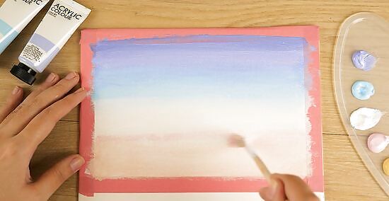 Take a slightly smaller brush and move it in X patterns to start blending in the colors. Then clean the brush you used for the white using water and some paper towels and go back and forth on the canvas to even out the color. You can blend as much as your heart desires. If you're changing colors drastically, finish painting a color and then wipe your brush on a paper towel. Wet it if needed, then dry it. Then use your next color.