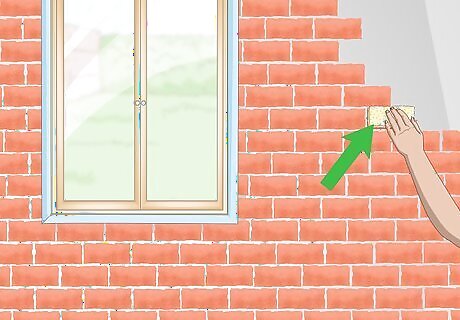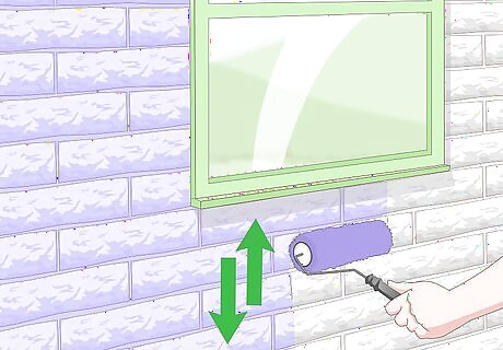 Sweep the roller up and down to fill in the unpainted gaps. After you’ve covered most of the faux brick with angled strokes, use smooth, continuous up and down motions to cover any spots that were missed. Work within 2–3 feet (0.61–0.91 m) wide sections to ensure even coverage. After you fill in one section, apply more paint to your roller and move on to another section. The up and down strokes should slightly overlap each other to make sure there aren’t any gaps.