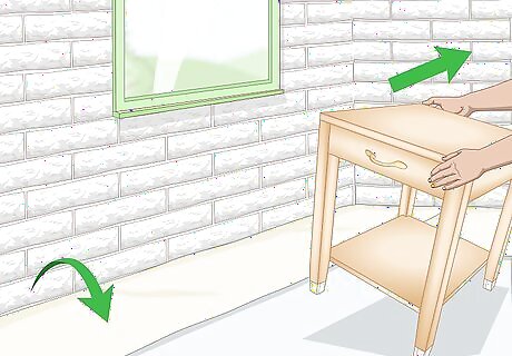 Clear the area of obstructions and lay down drop cloths. Before you begin to paint your faux brick, you need to clear out any furniture, decorations, or any other obstructions that could get in the way. You don’t want to have to stop in the middle of painting to slide a chair over and it isn’t safe to work in a room with obstacles that could cause you trip. Obstacles includes other people and pets, too! You can also use a tarp or newspapers to prevent paint from getting somewhere you don’t it.Tip: Use a baby gate to block off the room from any pets or small children.