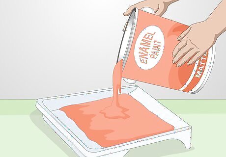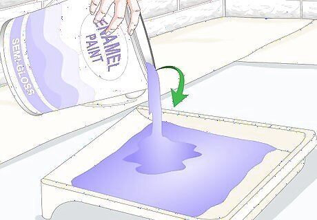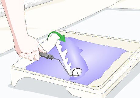 Fill the paint tray reservoir with paint. A paint tray is a plastic receptacle with a slope and indentations to allow you to add paint to a paint roller and remove the excess paint by running the roller over the indentations. Add your paint to the reservoir of the paint tray before you paint, taking care not to overfill it.