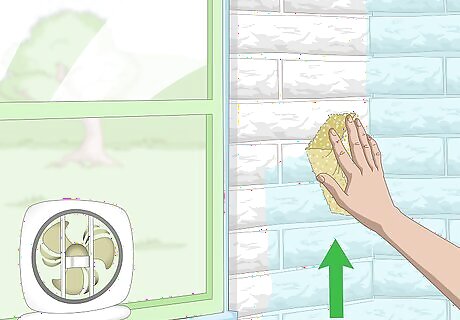 Wash the surface with a mixture of soap and warm water. In order for the paint to adhere correctly and without any bubbles or wrinkles, you need to clean the surface you plan to paint. In a bucket, mix ⁄2 cup (120 mL) of dish soap and 2 gallons (7.6 L) of warm water, and use a clean sponge or rag to scrub the surface clean of any dirt. You can use a toothbrush to scrub stubborn stains out of any grout lines. Use warm water to help the soap get sudsy so it can clean dirt from any cracks and crevices. Rinse the surface with clean water when you’re finished clean it to remove any soap residue.