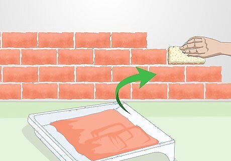 Dip a large sponge into the mixture and apply the paint to the wall. A large, rectangular sponge measuring about 8 inches (20 cm) long and 4 inches (10 cm) high will help make the work of forming bricks really easy. Lightly dip one side of the sponge into the brick paint color and dab it into the square formed by your painter’s tape. Use the other side of the sponge to wipe up any excess paint. Soak the sponge in clean water and wring it out before dipping it into the mixture so it’s already dampened to prevent the paint from clogging up the sponge.Tip: For a more distressed look, lightly dab the paint onto the wall.