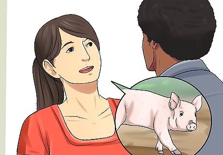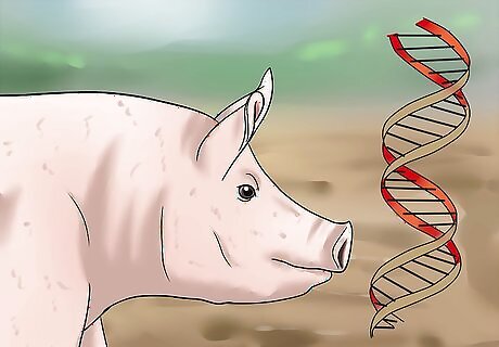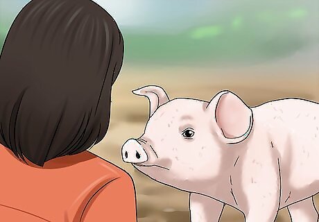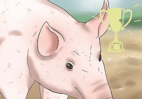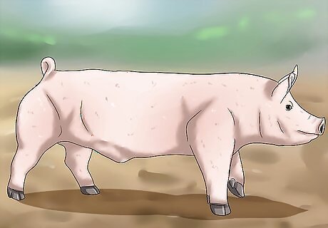 Determine if the pig is purebred or crossbred. The offspring of two purebred pigs of the same breed is considered a purebred pig while the offspring of two pigs from different breeds is considered a crossbreed pig. Purebred pigs may have some superior traits, such as leaner body mass and good bone structure. However, crossbreed pigs are sometimes healthier than their purebred parents due to heterosis, which is when the combined genetics of two breeds produce a superior offspring. Common breeds of pig include the Yorkshire, Hampshire, Berkshire, Chester White, Duroc, Landrace, Poland China, and Spotted Swine. Choosing a healthy pig is your main priority, but you may also want to consider a pig's genetics if you will be competing with your pig. Keep in mind that you will need to have a purebred pig's papers to register it as purebred for a competition. Ask to see these if you are considering a purebred pig. Deciding between a crossbred pig and a purebred pig depends on your project goals. For example, if you plan to use a gilt (female pig) for breeding, then you might want to select a white breed pig, such as a Chester White, because white breed gilts have better mothering abilities than other breeds.