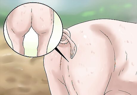 Look at the pig from behind. Checking a pig from behind can help you to determine if it has good strong legs. The legs should be straight and sturdy looking. You should also look for a 45 degree angle or V-shape between the pig's legs. If the pig's legs are wider or narrower than this, then the pig may not make a good project. Avoid pigs that have wide set legs or that have a square appearance from behind. This indicates that the pig may have too much fat on its body and will not produce lean meat, which is what most pork consumers prefer.