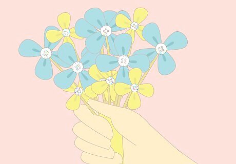 Use fake flowers over real flowers. This might seem tacky, but real quality flowers can be incredibly expensive. There are plenty of flower alternatives that will look just as good from a far and have their own charm up close. Sometimes you can get these for a fraction of the cost of real flowers—and pass them on to another couple once you've used them. Do some research to make sure the fake flowers you're buying are genuinely less expensive than real flowers cost. Higher quality silk flowers may actually be more expensive than some real flowers that are within season, particularly if you purchase an elaborate silk flower bouquet. However, if you put together your own bouquet using mid-range quality fakes from your local craft store, or even make some DIY crepe paper flowers instead of buying previously made fakes, you'll likely save some money. If you don't want to save your flowers, you also have the option of renting a bouquet made from fake flowers from some wedding stores.