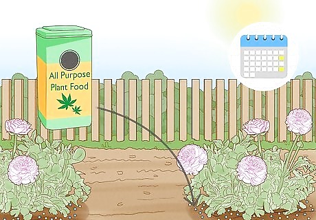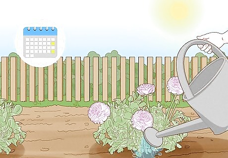 Water your ranunculus. You should make a point to water your tubers just after planting, as mentioned above. Continue to water your new plants once every 10 to 14 days. When the first foliage, or leaves, appear on your plants, you should try to water them once a week. Continue watering your plants once a week until fall comes around. In the fall, the ranunculus will die back, or go dormant, and will not need to be watered. Dormancy is covered more thoroughly in Step 5 of this section.