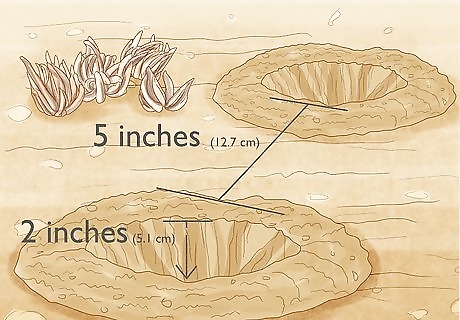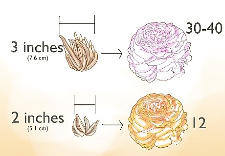 Plant your ranunculus from tubers (aka bulbs) if possible. Tubers, or bulbs, are generally the preferred way to grow ranunculus. A tuber is similar to a root; ranunculus tubers look like spiders, claws, or bunches of bananas. Their odd appearance is helpful when it comes to planting. Plant the tuber with the pointed ‘claw’ end or ‘spider’s legs’ facing downwards. To plant your tubers: You should plant smaller varieties so that they are about 2 inches (5.1 cm) deep and 5 inches (12.7 cm) apart from other tubers. Plant larger varieties, such as Ranunculus Tecolote, up to 12 inches (30.5 cm) apart. You don’t need to soak them before planting. It’s best to plant in batches of up to a dozen for maximum effect. Plant as soon as the last frosts have ended, usually in the spring. Water the tubers and the ground around them after you have planted them. Watering them will help to settle the soil. Do not water until sprouts emerge.