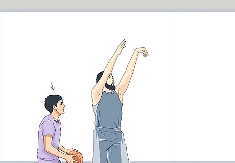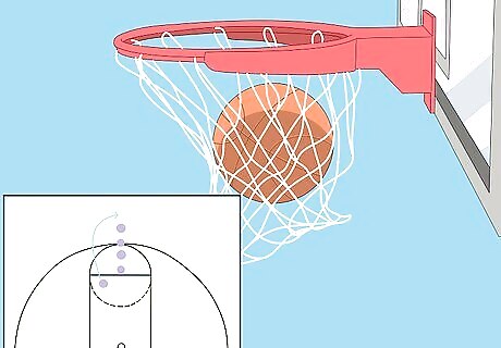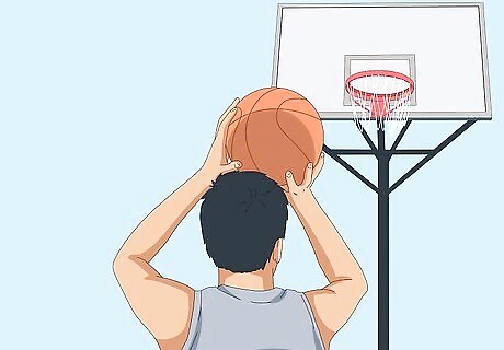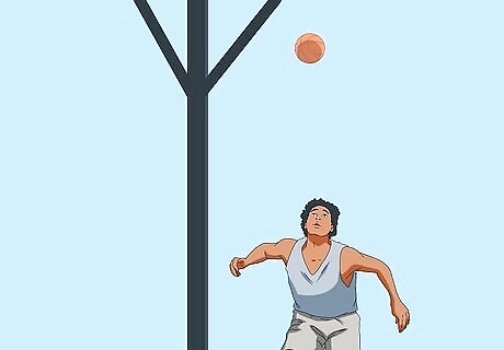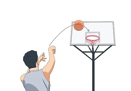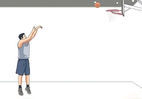 Shoot. As you shoot, straighten your body and jump. Simultaneously lift the ball so that your elbow is directly underneath the ball. The ball should be above your head, aligned with your eyes and the basket. Flip your wrist just before the high point of your jump to propel the ball toward the net. To maintain balance and aim, jump straight up. You should aim to land at exactly the same point from which you jumped.