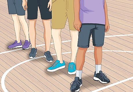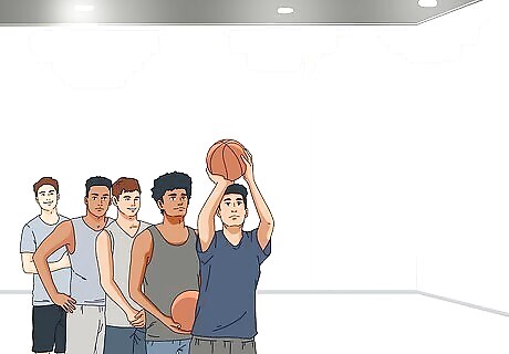 Assemble in a line behind the foul line. The first person in the line should be directly behind the foul line. The first and the second person should each have their own basketball. The foul line, also known as the free throw line, is a line on the court inside the three-point line. There should be a rectangle on the court that is adjacent to the semicircle which intersects with the three-point line. The foul line is the line where the rectangle and semicircle meet. The foul line is where professional players shoot from when they have been fouled. If you are playing at home and need to create your own line, the standard distance for the foul line is 15 feet from the backboard. Use a piece of chalk or tape to mark off the line.
