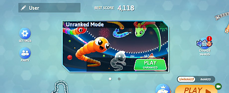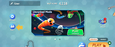 Go to the main menu. To go to the main menu, click the Snake.io app icon and once opened you will be directed immediately to the game's main menu. Here you'll see multiple options, like Settings, Party, Play etc.