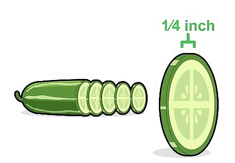 Slice your cucumbers. How thin you cut them is based on your pickle preference, but keeping them about ⁄4 inch (0.64 cm) should be fine. Use a mandoline to keep the thickness even. An even thickness allows for the taste to be more uniform.