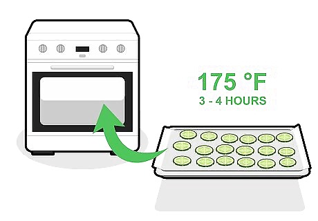 Bake at 175 °F (79 °C) 3-4 hours. Keep an eye on the cucumbers, checking to make sure the edges aren’t burning or turning black. Each oven cooks differently and cooking times will vary. You can also put the cucumbers in a dehydrator. Dehydrate them at 135 °F (57 °C) for 4-6 hours, or until they are dry and crisp.