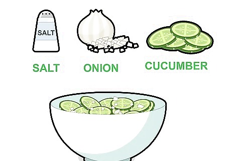 Mix cucumbers, salt, and onion in a large bowl. Toss the ingredients to combine them completely. Make sure the cucumbers and onions are covered in the salt. Cover the bowl and let the cucumber onion mixture sit for an hour.
