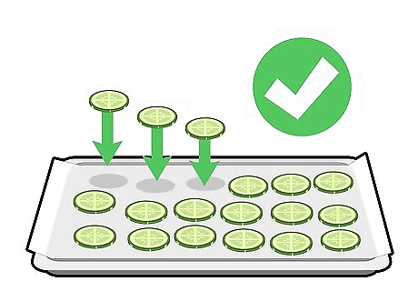 Place the cucumber slices on a baking sheet. This will make sure they freeze evenly. If you just put them in a zippered freezer bag, then the cucumbers slices will freeze clumped together. You can line the baking sheet with parchment paper to make it easier to remove the cucumbers when frozen. Once frozen, you can move the slices to a zippered freezer bag for easy storage. Frozen cucumbers can be used to infuse water, make dips, and make smoothies.