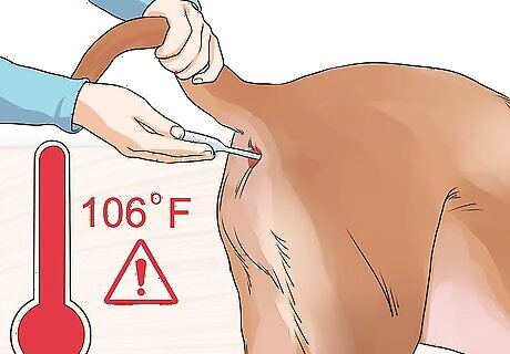 Take your dog’s temperature. A dog’s natural temperature is slightly warmer than that of humans: around 101°F. If your dog’s temperature rises above 103°F, it is overheating, and brain damage can occur if the animals temperature rises above 106°F. To take your dog’s temperature, you’ll need to use a sanitary rectal thermometer. Oral thermometers are not an effective instrument to take a dog’s temperature. To use the thermometer, first coat the tip of the instrument in petroleum jelly, to act as a lubricant. Then insert the tip of the thermometer about an inch into your dog’s anus; the thermometer will display a result within 60 seconds. Wash the thermometer after each use.