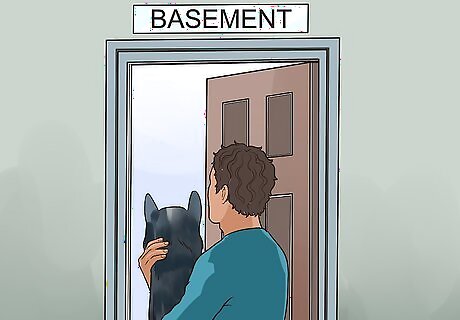 Bring your dog inside. If your dog is overheating outdoors, you should bring it inside to cool down. If it’s a hot day, your basement or pantry may be the coolest room in your house. Lead the dog here, and have it sit or lay down in the room. If you have a small house fan, you can put this in front of your dog to help it cool off. If you are away from your home and cannot quickly bring your dog indoors, you’ll need to provide your dog with access to shade. Lead your dog under a large tree, or into the shade of a building. This will help prevent your dog from overheating more.