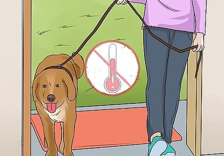 Remove your dog from a hot environment. Older dogs are likely to overheat they spend hours in a hot environment, and lack the presence of mind to leave a hot environment. To help your dog cool down, remove it from the hot environment—this could be a hot car, a field in which the dog has been running, or the outdoors on a sunny day. You’ll also need to stop your dog from engaging in activities that raise its body temperature, including running and playing. Have your dog sit or lay down in a cool environment for at least 20 minutes. Avoid careless mistakes which may lead to overheating, like leaving your dog in the car or forgetting to provide shade for your dog if it’s left outside on a hot day.