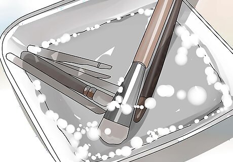 Sanitize your makeup brushes. You will most likely be using brushes to apply your foundation etc. Ideally, you would wash your makeup brushes after each use, using soap and warm water or baby shampoo. In reality, however, this is somewhat difficult to do on a daily basis. You can try spritzing your makeup brush with a brush cleaner after each use or, at the very least, wash your brushes every two weeks. This will prevent the bacteria that is naturally present on your face from staying on the brush and multiplying. Leave your brushes out to air day after washing them. It is important that they dry completely, as a moist environment can further the growth of any germs that are present. Always wash your brushes before using them on someone else.