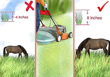 Perform pasture rotation. Pasture rotation involves moving horses from pastures with a heavy parasite load to those with fewer parasites. It also prevents overgrazing, which increases the chances of a horse ingesting parasite larvae. Deworm your horses before moving them to a new pasture to prevent contaminating the new pasture with parasites. If you have foals, move them to the cleanest pasture to minimize their exposure to parasites. Other tips for pasture rotation include: Dividing your pasture areas into multiple sections. Moving your horses when the grass in the current pasture area is 3-4 inches (8-10 cm) high. Mowing the grass after moving your horses to a new pasture. Allowing the grass to grow back to about 8 inches (20 cm) before putting your horses back in that pasture area.