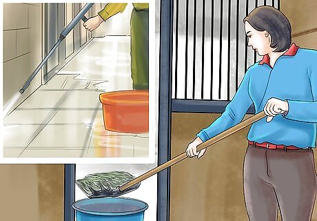Clean your horse’s stall regularly. When horses defecate in their stalls, parasite larvae can crawl up the sides of the stall walls. If your horse licks the walls, it could ingest the larvae and become infected. Clean the stall to prevent parasite infections. At a minimum, muck the stalls once a day. Tips for cleaning horse stalls are below: Use proper cleaning equipment: metal pitchfork, broom, scrub brush, a large bucket to hold the manure, and a wheelbarrow. Keep your horse out of the stall when cleaning. Either tie up your horse outside the stall or put it out on pasture. Remove the manure with the pitchfork and place the manure in the wheelbarrow. Sift the bedding through the pitchfork to minimize how much bedding you need to replace. Clean the water bucket with clean water and a scrub brush. For an intensive cleaning, remove everything from the stall to sweep and disinfect the floors and walls. Disinfect the water bucket as well. Allow the stall to dry completely before restocking the stall. 10% bleach is a good disinfectant.