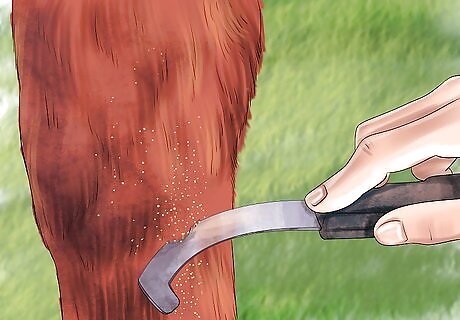 Remove bot eggs from your horse’s coat. Adult bot flies tend to lay their eggs on the insides of a horse’s knees, where a horse could easily lick them up. The eggs are tiny and white. To remove them, you can use a fine-toothed comb or a dull blade. If you use a dull blade, be careful not nick your horse’s skin and cause bleeding. Bot knives are also available that can remove the eggs. In addition, you could use sandpaper or a synthetic stone grooming block.