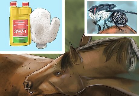 Ask your vet about insecticide treatments. In addition to worms, horses may suffer from a variety of external and internal insect infestations. For example, if bot flies lay their eggs in your horse’s coat, the larvae may be ingested by the horse and burrow into the lining of the horse’s mouth and stomach. Insecticide treatments can break the life cycles of bot flies and other insect pests. Depending on the type of infestation, your vet may recommend that you: Use an external insecticide, such as Ivermectin paste. Always follow your vet’s application directions carefully, and wear appropriate protective attire (such as gloves). Use an oral insecticide, such as a feed additive or bolus, or an injected insecticide. Treat your horse’s living area with insecticides to prevent infestations. Use the insecticide at regular intervals, when the parasites are most likely to lay eggs. This time period may vary according to the parasite species and your geographic location. Your vet can help you determine when to use the insecticide.