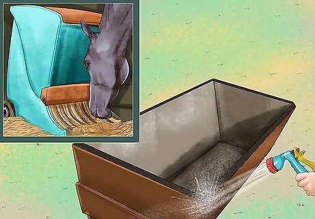 Feed your horse from a rack or trough. If your horse eats off the ground, it could ingest parasite larvae while eating. To prevent this, put your horse’s food in a rack or trough. Clean the rack or trough regularly with clean water and a scrub brush.